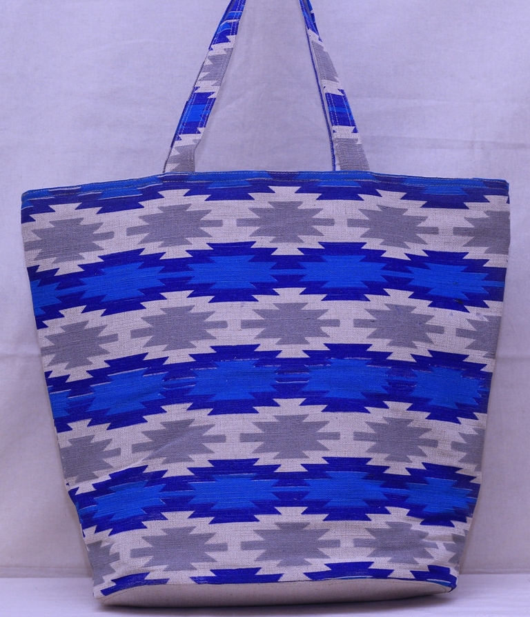 This beautiful royal blue, turquoise and gray color JuteCO beach bag is hand printed in the traditional way. An ample space and practical for the beach, for Mum’s bag to hold the baby’s and children’s necessities, for an everyday bag, a travel bag, the design is perfect. The interior of the bag is lined with light Calico cotton. So soft, light in weight and foldable. Has an interior YKK zip pocket and an open pocket.